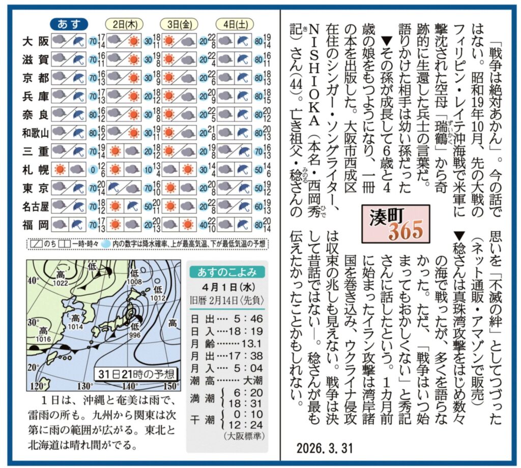 シンガーソングライター NISHIOKAが取り組む「不滅の絆」プロジェクトが、2026年3月31日付の産経新聞夕刊一面コラム「浪速風」に掲載されました。