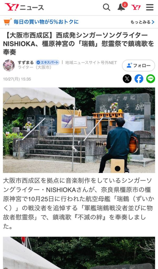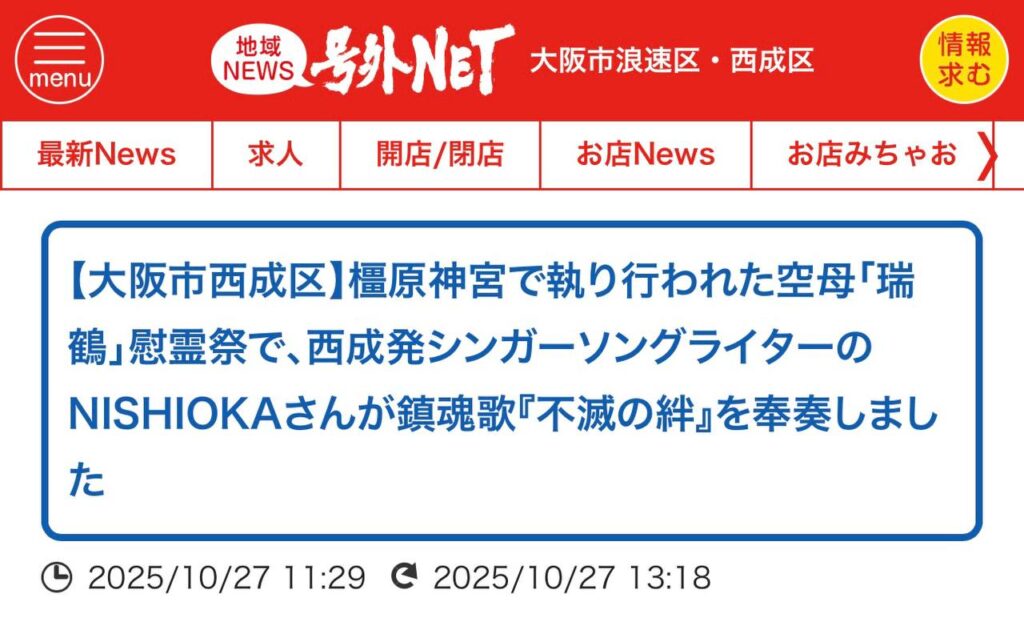 🕯️ 号外NETに掲載:NISHIOKA、『不滅の絆』を橿原神宮で奉奏 10/25「軍艦瑞鶴慰霊祭」にて鎮魂歌を捧げる 大阪市西成出身のシンガーソングライター NISHIOKA が、2025年10月25日(土)に奈良県橿原神宮で開催される「軍艦瑞鶴戦没者並びに物故者慰霊祭」に... -