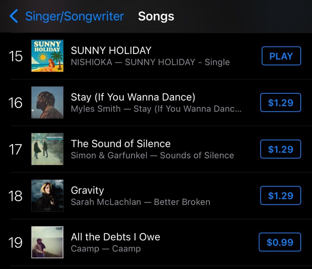 【チャート速報】NISHIOKA『SUNNY HOLIDAY』が 全米 iTunes シンガーソングライター部門 第15位 にランクイン!